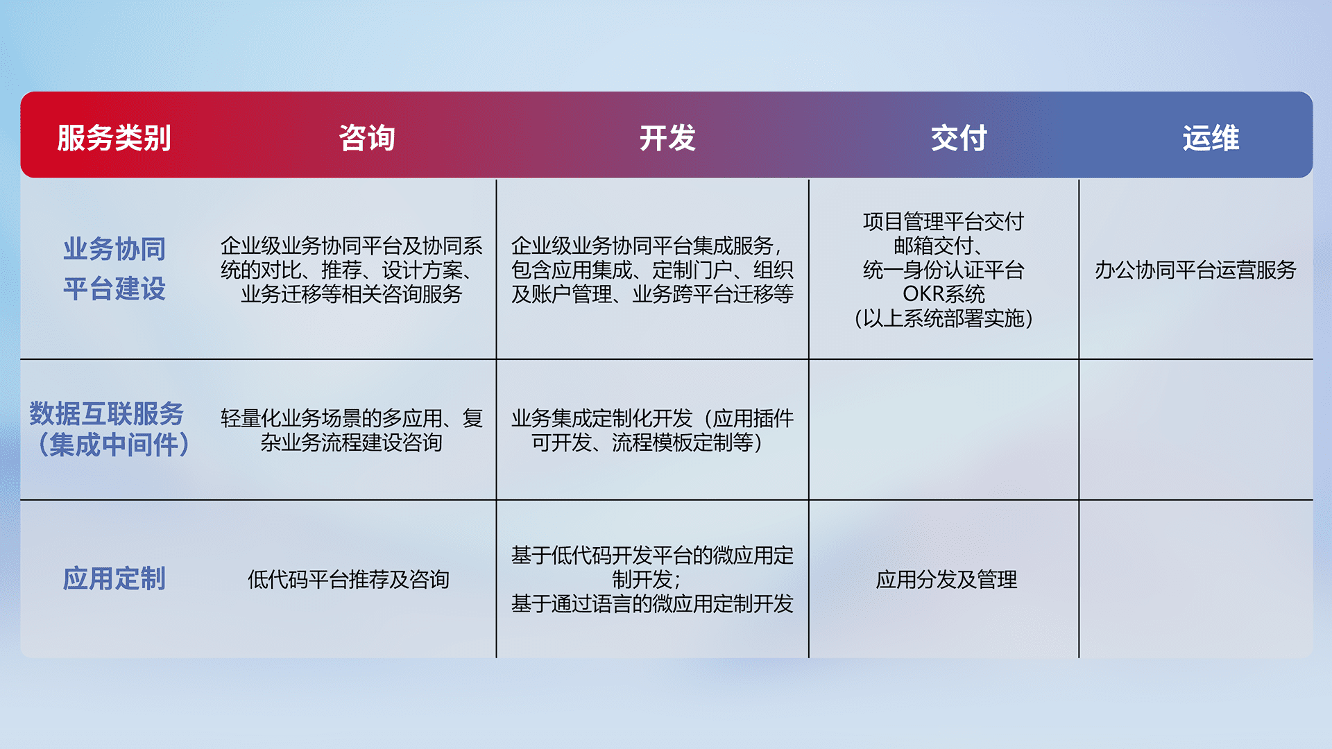 针对钉钉、、、、企微、、、IDaas等平台级产品提供产品的规划、、方案、、交付、、定制化开发等服务,,,实现如统一协同办公、、智能客户服务、、混合会议管理、、智能数据查询、、、、等业务场景,,实现数字化转型。。